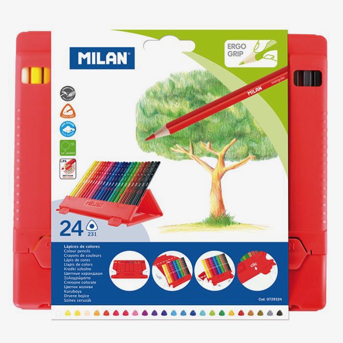 Estuche flexible de polipropileno con 24 lápices de colores. Mina de 2,9 mm Ø. Forma triangular ergonómica. La mina ofrece un trazo uniforme y es resistente a la rotura, gracias al sistema LPS (Lead Protection System) que protege la mina gracias a su adhesión con la madera. Madera procedente de plantaciones sostenibles.