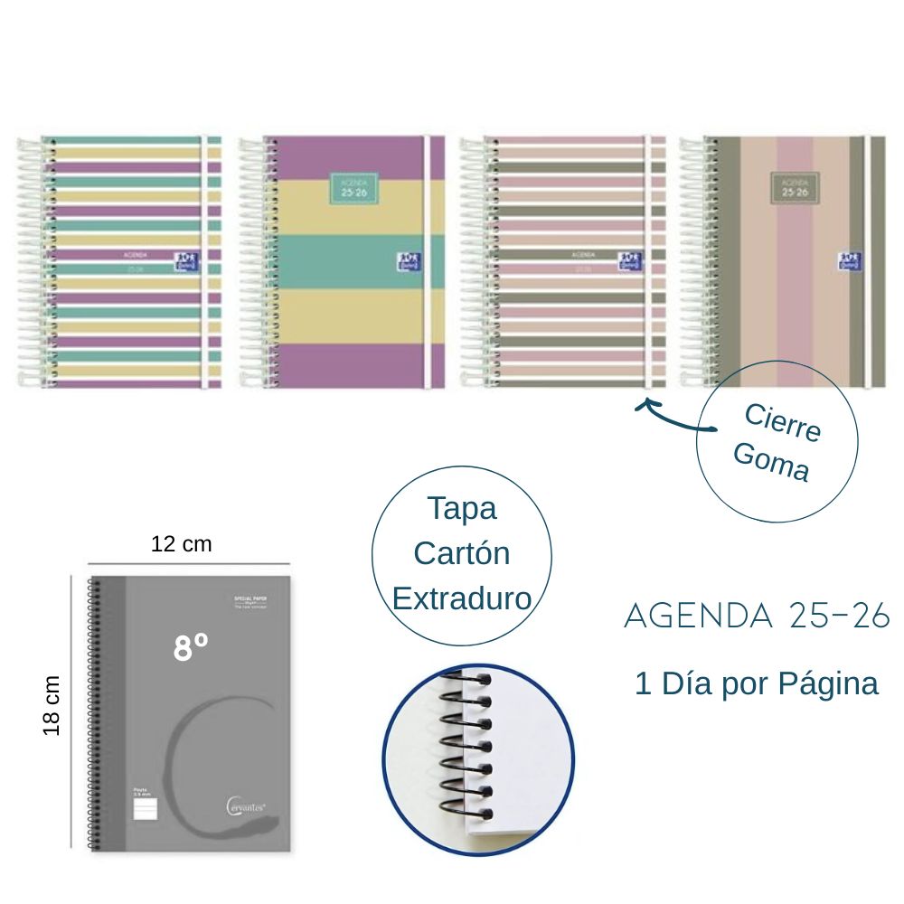 Agenda Oxford Color Block 8º Día Página en castellano. Tapas extraduras de cartón con peliculado suave, barniz selectivo y cierre con goma. Dos diseños disponibles. Anualidad de septiembre a agosto, para todo el curso escolar. Interior Nude Azul, ideal para organizar todas tus tareas con espacio a final de página para destacar lo más importante de la semana. Además, cuenta con muchas hojas para notas, listas y recordatorios. Con uñero microperforado. Compatible con la aplicación SCRIBZEE.