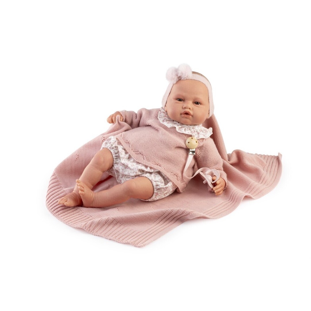 Edad recomendada: +14 años. Medidas: 50 cm. Cuerpo blandito y tacto especial. Incluye: Diadema, chupete, jersey, culotte y mantita. Reborn Baby Love es una muñeca hiperrealista de 50 cm, con cuerpo blandito y un tacto especial que la hace única. Su piel sonrosada, venitas delicadas y manicura han sido pintadas a mano, recreando con detalle la belleza de un auténtico bebé. Además, incluye su certificado de autenticidad y un libro de familia, convirtiéndola en una muñeca única y especial. Viste con un conjunto de punto en color rosa y culotte y babero con un estampado de flores ¡Si es que esta Reborn va a la última tendencia! ¡Descubre la magia de tener un bebé real en tus brazos!