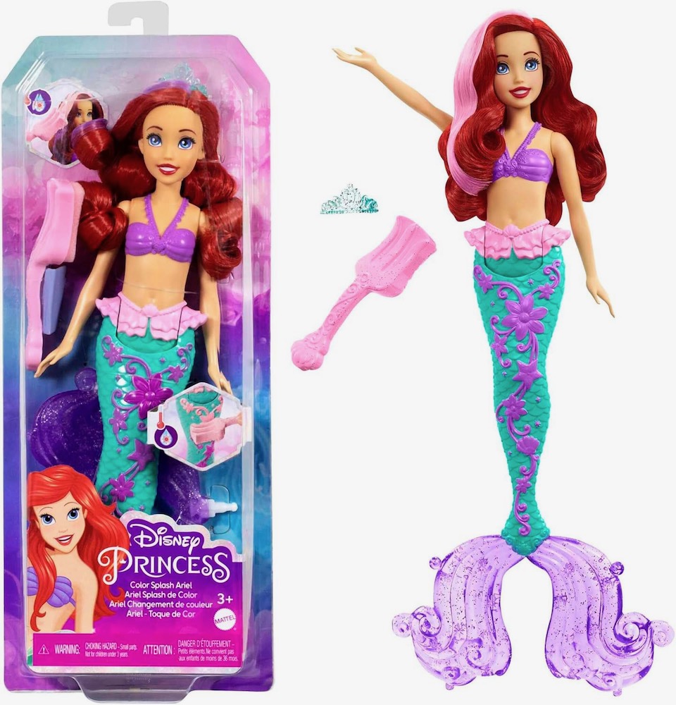 Con el pelo y la cola que cambian de color, a los más pequeños les encantará transformar a esta sirena Ariel una y otra vez. Inspirada en el personaje animado de la popular película de Disney La sirenita, la muñeca Ariel Toque de color cambia de color su pelo y su cola. Los peques pueden usar el aplicador de estilo “cachivache” y el agua caliente para activar la magia de los colores. Al igual que en la película, la muñeca Ariel lleva su característica cola de sirena y su top de conchas marinas.