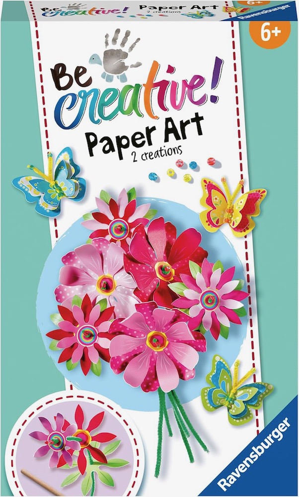 Edad recomendada: +6 años. Con el juego BeCreative Paper Art Flowers & Butterflies de Ravensburger los niños a partir de 6 años hacen coloridas flores y mariposas mágicas. Simplemente combine las piezas de cartón preperforadas y las perlas a voluntad y fíjelas con los limpiapipas. Ya sea como decoración o para regalar: las flores y mariposas de Ravensburger son sin duda un punto de atracción.