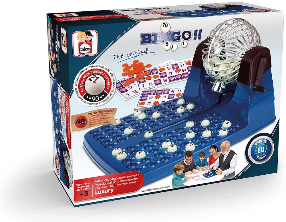Con la Lotería Automática Lujo las tardes de entretenimiento en familia ya están completas. Siente la emoción de ese momento mágico en que aparece el número que te falta y puedes cantar línea o bingo. Coloca las bolitas en sus espacios y aguarda a que te sonría la fortuna. Incluye 48 cartones y fichas de juego. La numeración indeleble de las 90 bolas está especialmente tratada para que no se borren con el uso continuado. Edad recomendada: +3 años.