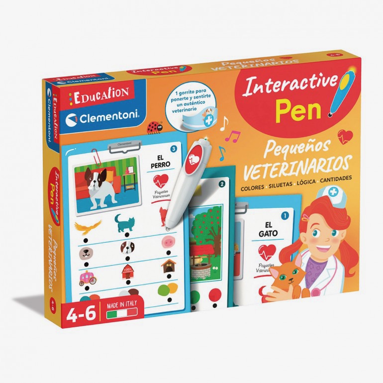 Edad recomendada: +4 años. Tamaño de caja (AxPxA) 37 x 28.1 x 5cm. 6 tarjetas grandes con 12 actividades educativas y más de 100 preguntas que los niños resolverán utilizando el bolígrafo electrónico. Juego Boli Interactivo Veterinaria. Descubre el mundo de los animales como un veterinario de verdad.