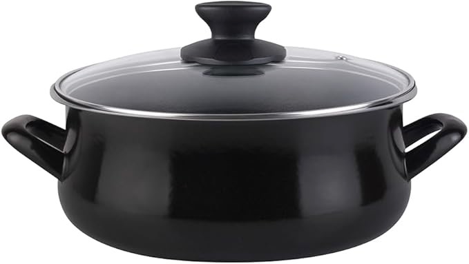Fabricado en acero esmaltado vitrificado a 820º. Recubrimiento antiadherente bicapa reforzado libre de PFOA. Dos capas de esmalte exterior color negro.