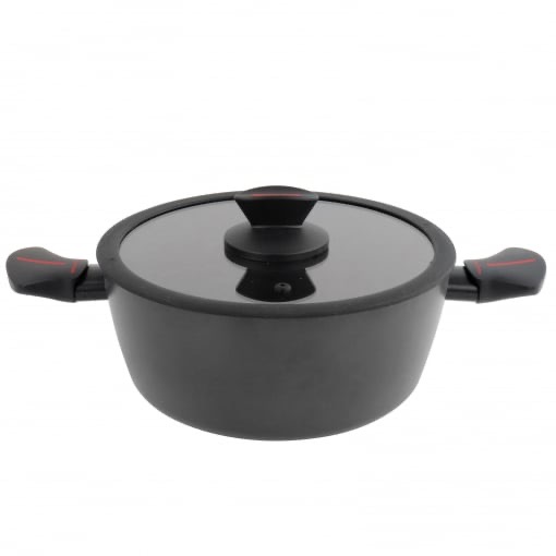 Cacerola 24Ø con tapa gama Maestra Magefesa. Exterior color negro. Antiadherente tricapa reforzado libre de PFOA . Herrajes ergonómicos soft-touch termoaislantes. Fondo 100% full induction.