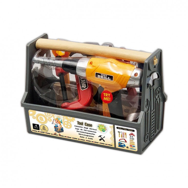 Edad recomendada: +3 años. Caja de herramientas con asa de 22 piezas, contiene taladro, destornillador, alicate, martillo, llave para tuercas, regla, sargento, tornillos, tuercas y piezas para ensamblar. Facil de guardar y de transportar.
