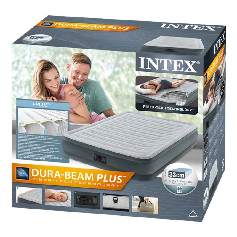 CAMA DE AIRE FULL COMFORT-PLUSH MID RISE 137X191X33 CM. Colchón hinchable Intex con tecnología Fiber-Tech, línea Comfort Plush, medidas: 137×191 cm y altura: 33 cm, resistente al agual y a los roces, peso: 6 Kg Tecnología Fiber-Tech: miles de fibras de poliéster de gran resistencia que no se estiran ni con el tiempo ni por el uso, estabilidad duradera Colchón en color gris y acabado flocado de textura suave, estructura de borde único para mayor firmeza y superficie acanalada para un mejor descanso Colchón hinchable para uso individual o doble, peso máximo que soporta: 237 Kg, la altura doble proporciona un fácil acceso y uso del colchón Tiempo de hinchado: 2 minutos, bomba eléctrica de 220/240 V integrada y sistema 2-1 para rápido inflado y desinflado, pliegue compacto, incluye bolsa con asas