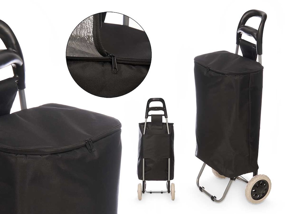 Dimensiones del Producto: 34,5 x 94 x 9 cm. Material: Bolsa: PVC + Poliester + Aluminio + Carro: Metal + PP Colores: Negro Capacidad: 32 L Medida Adicional: Bolsa: 54 x 32 x 20 cm Montado : 34.5 x 28 x 94 cm.