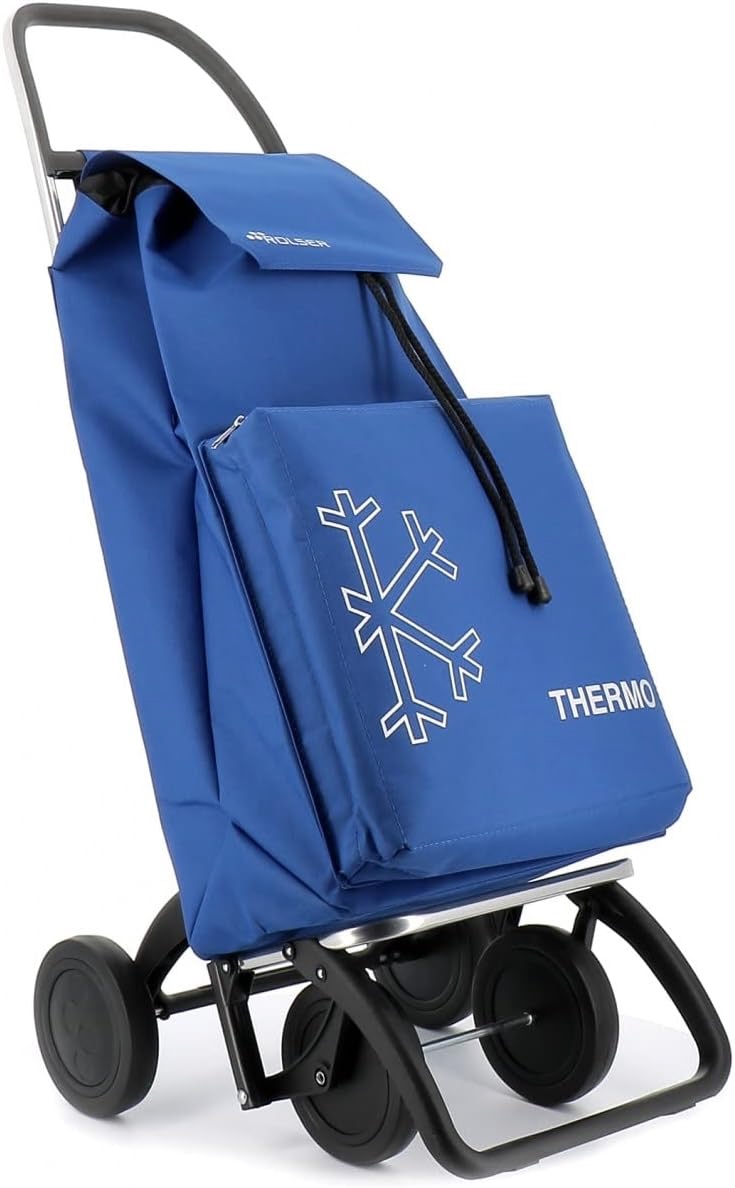 Dimensiones Abierto 4 Ruedas (mm) 390 x 470 x 925 mm Dimensiones Plegado (mm) 390 x 215 x 1050 mm Carro Rolser de aluminio de 2/4 ruedas, para evitar que el usuario cargue con el peso de su compra. En posición de dos ruedas para llevar detrás cuando está vacío, y empujando delante cuando está lleno con 4 ruedas. Chasis con apoyo delantero y base inferior abatible para guardar en espacios pequeños. Te ayudará con cualquier tipo de traslado de pequeñas cargas. Perfecto para llevar la carga de la lavandería, playa, shopping, pesca, gimnasio, etc… La bolsa Saquet Thermo tiene gran capacidad, cierre de cordón, bolsillo térmico delantero y se adapta fácilmente al chasis con una solapa.