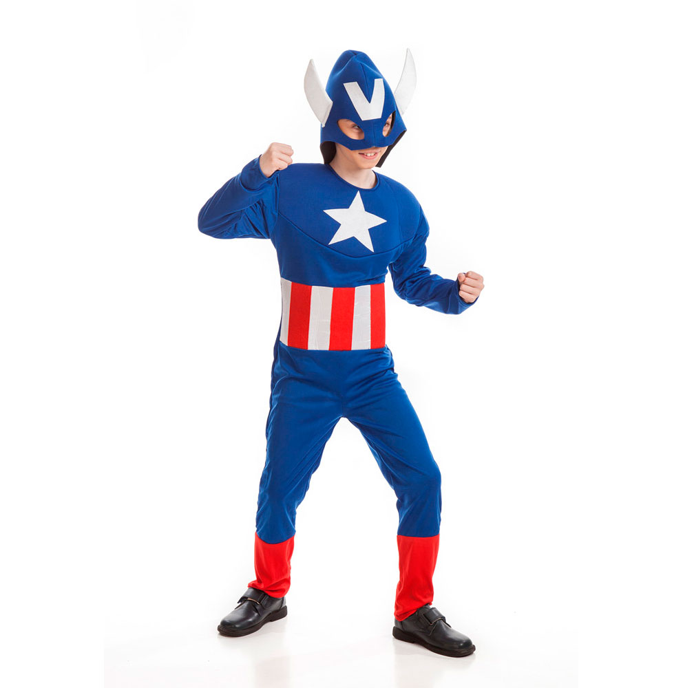 Disfraz héroe americano. Talla: 8-10 años. Contiene: mono y casco.