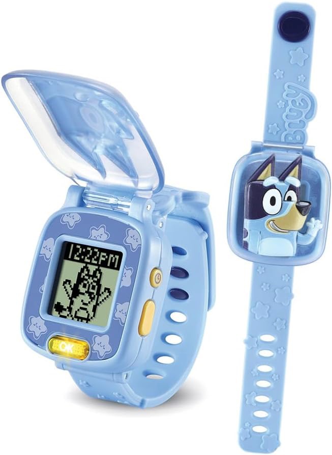 Edad recomendada: +3 años. ¡ES LA HORA DE APRENDER! Un reloj interactivo con las voces originales de Bluey y Bingo, funciones como cronómetro, alarma o cuenta atrás, y 4 juegos educativos para divertirte. Personaliza además tu reloj con diferentes esferas y tonos para la alarma. 4 ACTIVIDADES Y 3 NIVELES DE JUEGO; Bingo a la carrera: ¡Ayuda a Bingo a esquivar los obstáculos! De dos en dos: Empareja los objetos para que Bluey y Bingo tengan las mismas cosas. ¡Arriba, arriba!: Pulsa los botones y mantén los globos en el aire. Encuentra a Floppy: ¡Bingo ha escondido a Floppy! ¿Podrás encontrarlo? ESFERAS DEL RELOJ: Personaliza tu reloj con 8 imágenes distintas. CRONÓMETRO: ¡Usa el cronómetro para contar el tiempo con tus amigos! ALARMA: Elige entre tres tonos distintos para tu alarma. ENSEÑA vocabulario, números, estimula la memoria y el aprendizaje de las horas. Incluye las voces originales de Bluey y Bingo.