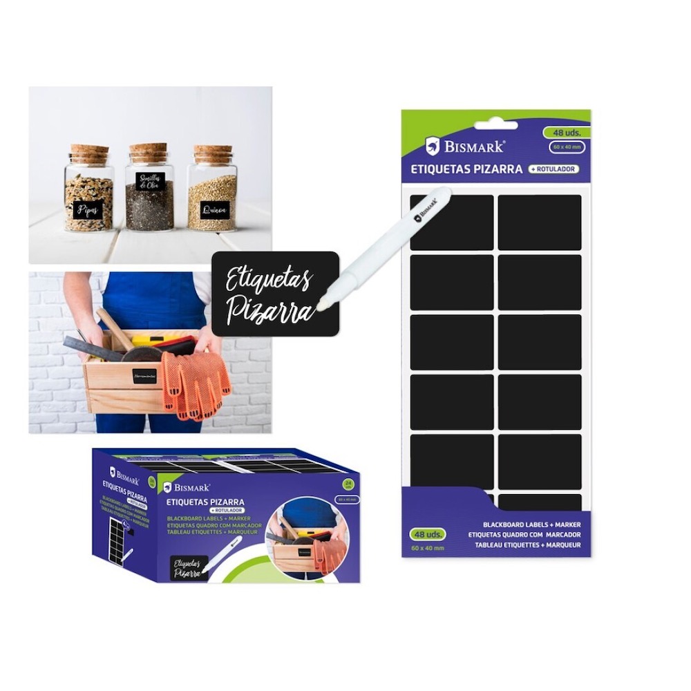 Medidas: 40 x 60 cm. Cajas de 24 unidades. Etiquetas negras tipo pizarra + rotulador blanco.