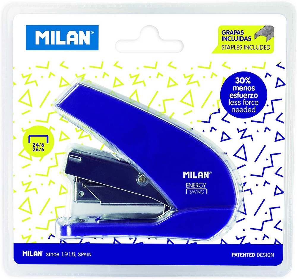 Grapadora Milan Blue con cuerpo de plástico rígido antichoque con sistema Energy Saving para facilitar su uso. Impulsor de grapas guiado sobre carriles y arrastre metálico articulado. Grapas: 24/6 26/6.
