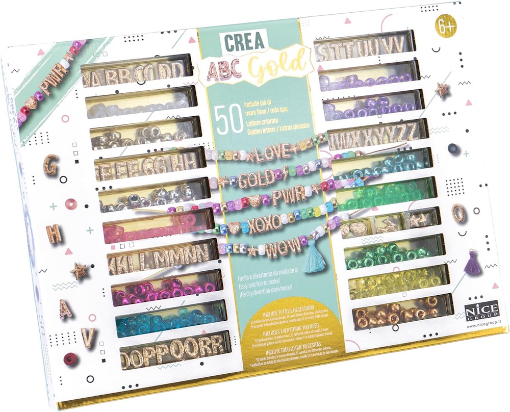 Edad recomendada: +6 años. Dimensiones: 33 x 24 x 3 cm. Cuentas ABC Precious Gold: juego de más de 300 cuentas de moda de estilo “dorado”, de diferentes colores y con letras e iconos dorados, útiles para inventar pulseras y accesorios decorativos. CONTENUTO: el paquete está enriquecido por 260 cuentas abc de color pastel y metalizado en forma esférica, con 6 colgantes de corazón, estrella, rayo, con 52 letras vocales y consonantes y 7 m de hilo elástico dorado para crear pulseras, collares y decoraciones. Uso: gran idea para involucrar a los niños en un cumpleaños, en actividades extra escolares, permitiéndoles expresar la creatividad, personalizando las pulseras con su apodo o lema favorito.