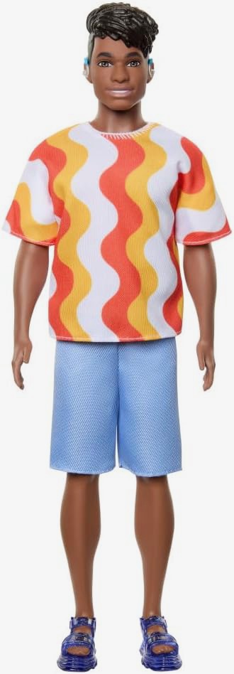 Diseñadas para reflejar el mundo que los niños y las niñas ven hoy en día, las muñecas Barbie Fashionistas presentan una amplia variedad de tonos de piel, colores de ojos, tipos de cuerpo y estilos, así como peinados, colores y texturas. Este muñeco de moda Ken derrocha estilo con un conjunto que acapara todas las miradas, formado por una camiseta con un estampado naranja y amarillo chulísimo y unos pantalones cortos azules. Tiene un cuerpo de complexión fuerte, el pelo negro esculpido muy corto y audífonos en las orejas. ¡Las sandalias de goma de color azul completan su look divertido y fresco!