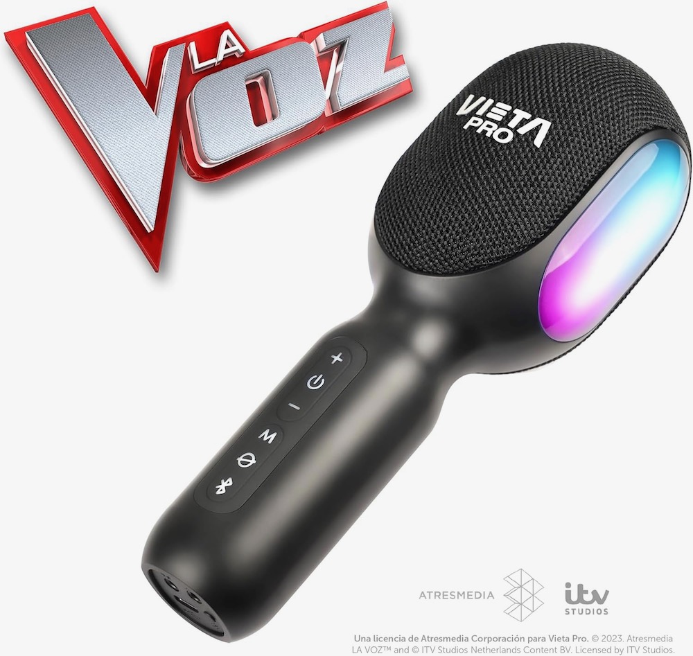 ¡Ya está aquí el micrófono oficial de la Voz! El Karaoke Party de Vieta Pro es un micrófono de alta calidad que viene con un altavoz incorporado. Una de las características más interesantes de este producto es la opción true wireless, que te permite conectar dos micrófonos a un mismo dispositivo, lo que resulta perfecto para disfrutar de la música y cantar con amigos y familiares. Además, cuenta con cuatro modos diferentes de configuración y la opción de bajar la voz de las canciones para que puedas disfrutar de una experiencia de karaoke aún más auténtica. El dispositivo también viene con una batería de hasta 10 horas de duración y una potencia de 18 W, lo que significa que puedes usarlo durante horas sin preocuparte por quedarte sin energía. Otra ventaja de este producto es que viene con una entrada auxiliar y USB, lo que significa que puedes conectarlo a diferentes dispositivos, como tu teléfono móvil, tablet o computadora, para reproducir tus canciones favoritas.