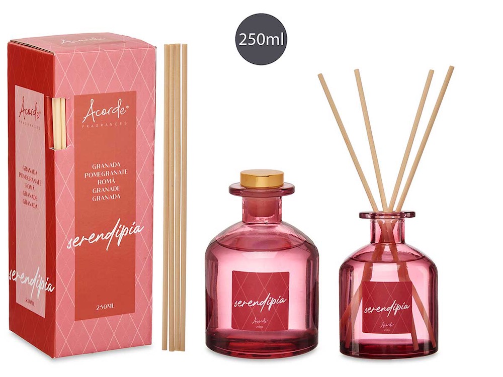 Dimensiones del Producto: 8 x 8 x 12 cm. Material: Vidrio + Fragancia Colores: Rosa Capacidad: 250 ml Duración: +- 45 -50 dias Medida Adicional: Varilla: 23 cm