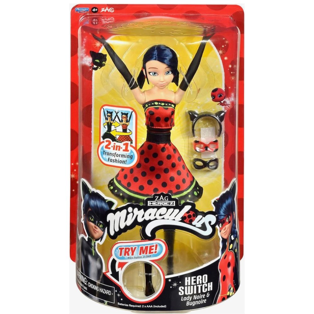 Edad recomendada: +4 años. Auténtico: la muñeca Miraculous Hero Switch mide 10.5 pulgadas y está esculpida para que coincida con el personaje animado de Ladybug de la serie de televisión “Miraculous Ladybug” Cambia de moda (e cambia de nuevo): función de cambio de moda 2 en 1 con solo pulsar un botón. Cambia de la moda de tul negro Lady Noire al rojo y negro de Bug Noire al instante. ¡Y cambia de nuevo! ! Accesorios: la muñeca Miraculous Hero Switch viene con una diadema de orejas de gato y dos máscaras extraíbles, una para cada atuendo.