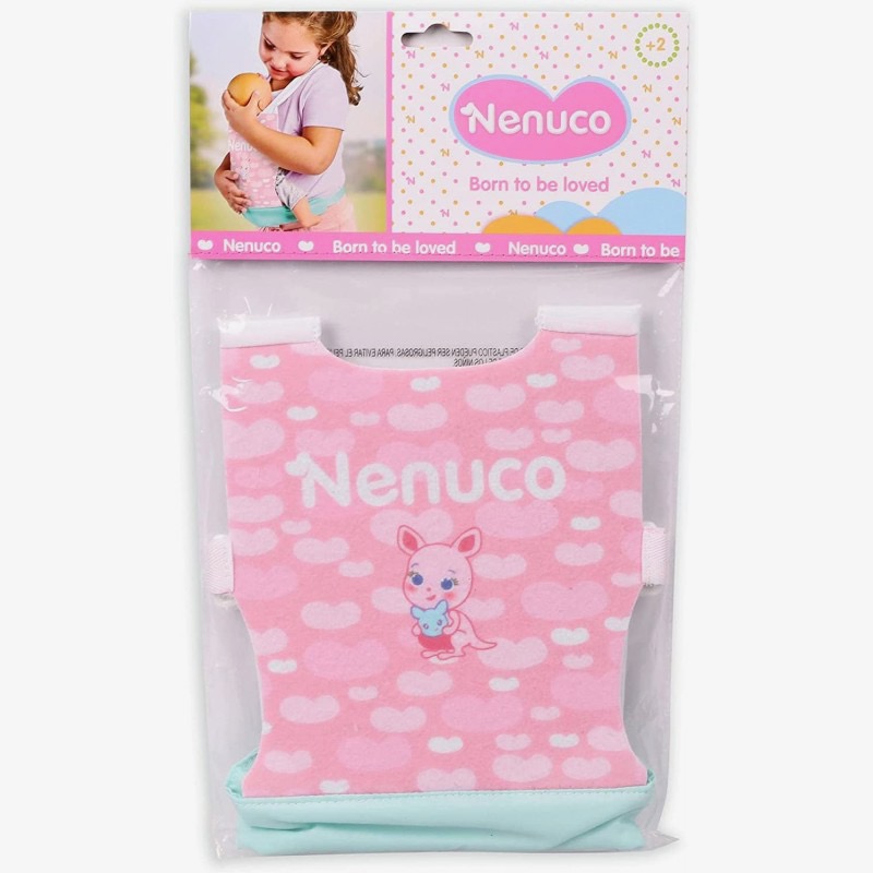 Portabebés para llevar a Nenuco colgado del pecho de la niña o del niño. De material blandito y adaptable, para poder sujetarlo mejor. A partir de 3 años