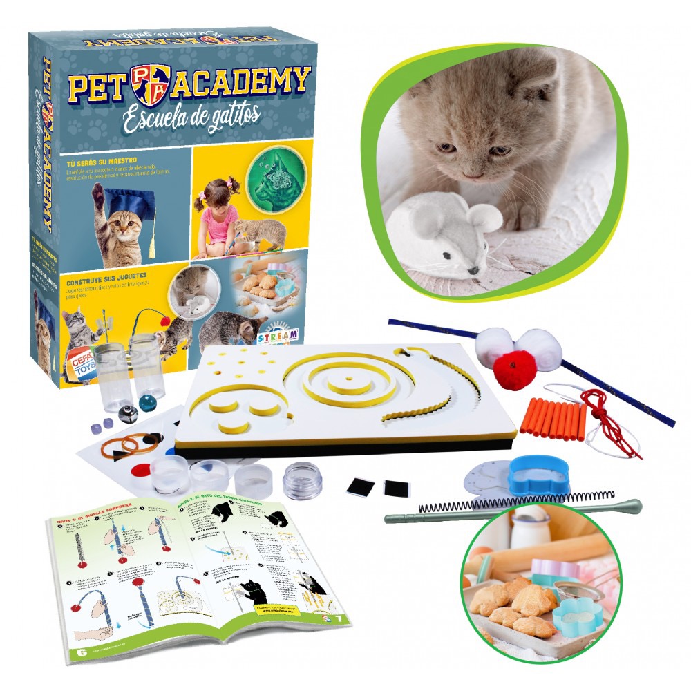 Edad recomendada: +6 años. Enseña a tu mascota reglas básicas de obediencia y disfruta descubriendo sus habilidades. Juguetes interactivos y retos de inteligencia para gatos ¡Tanto tú como tu mascota os divertiréis un montón! Descubre con tu gato el sorprendente reto de la Senda del Cocodrilo, la Carrera de Canicas, el reto del Tarro Giratorio, el Reloj de Arena y el Laberinto y el Muelle Sorpresa.