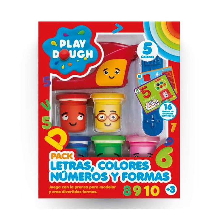 Edad recomendada: +3 años. PACK DE PLASTILINA PLAY DOUGH, CON TODO LO NECESARIO PARA JUGAR Y APRENDER, CREANDO FORMAS Y POTENCIANDO LA CREATIVIDAD. CONTENIDO: 5 BOTES DE PLASTILINA PLAY DOUGH, PRENSA CON 2 MOLDES Y LÁMINAS CON 16 ACTIVIDADES.