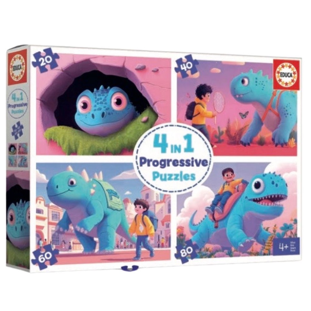Edad recomendada: +4 años. Set con 4 puzzles progresivos de 20 a 80 piezas. · Imágenes coloridas con mucho storytelling. · Escenas cotidianas en la vida de un niño o una niña.