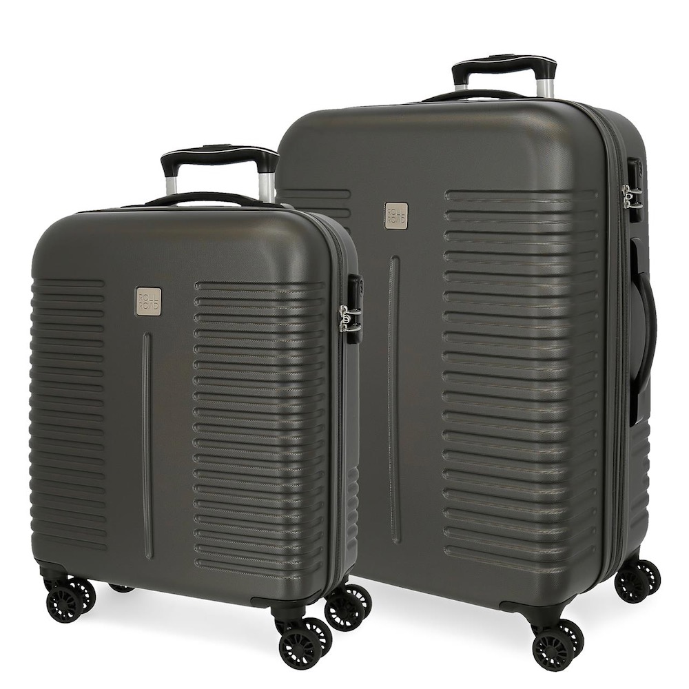 JUEGO DE MALETAS ROLL ROAD INDIA RÍGIDAS 55-70CM ANTRACITA Medida de cabina: 55x40x20cm. Medida mediana: 70x48x27cm. Peso de cabina: 2.5 Kg. Peso mediana: 3.7 Kg. Ruedas dobles que permiten un desplazamiento cómodo, un rodaje suave y una maniobrabilidad sin esfuerzo. Cierre de combinación lateral para aumentar la seguridad del equipaje Un compartimento con un bolsillo de cremallera en uno de los lados y gomas elásticas de sujeción en el otro. La pequeña es para equipaje de mano. La mediana trae refuerzos laterales para ofrecer mayor resistencia a la maleta. Además, puedes ampliar la capacidad de la maleta hasta 5 cm más para llevar más equipaje en cualquier momento.