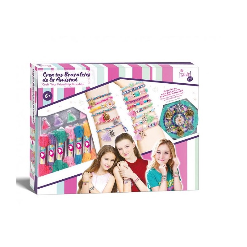 Edad recomendada: +5 años. Set para fabricar pulseras de la amistad. Incluye hilos de algodón de diferentes colores, borlas, cuentas y sobre todo 7 colgantes metálicos espectaculares. Para ayudar en la fabricación, el set incluye una rueda de pulseras con tarjetas de patrones. Asi será mucho más facil diseñar y montar las pulseras.