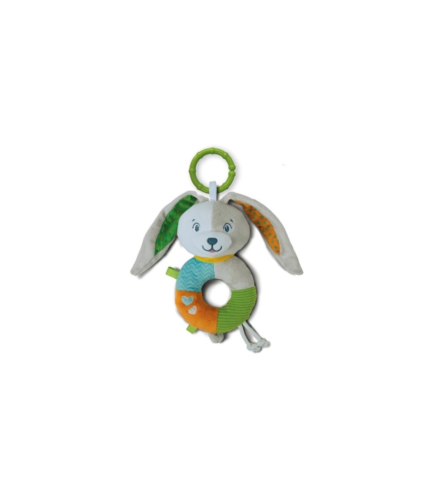 ¡Un suave conejito sonajero para abrazar! Fácil de sujetar, el conejito es ideal para estimular y entretener a los más pequeños. Con diferentes tejidos y colores vivos apoya el desarrollo de la percepción y la destreza visual y auditiva. La práctica anilla se puede enganchar en varios puntos, para colgar al conejito en cualquier lugar y llevarlo siempre contigo. Concebido, diseñado y desarrollado en Italia. Edad recomendada: +0 meses.